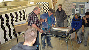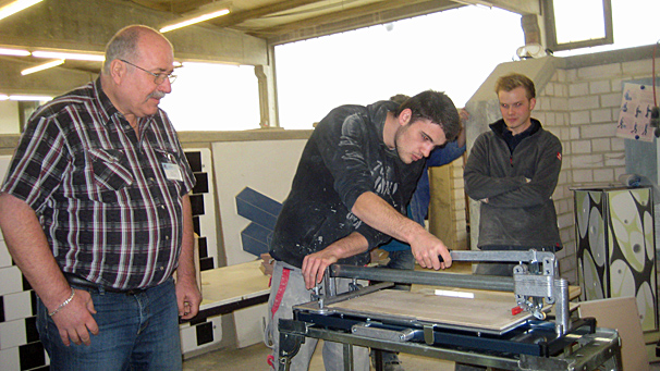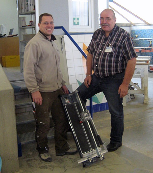 Vorführung von Werkzeugen für das Fliesenlegerhandwerk.