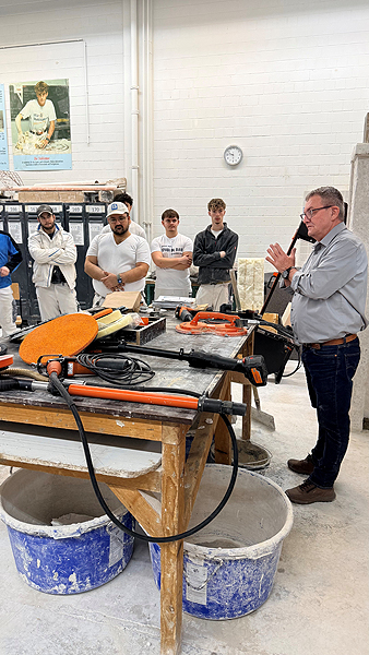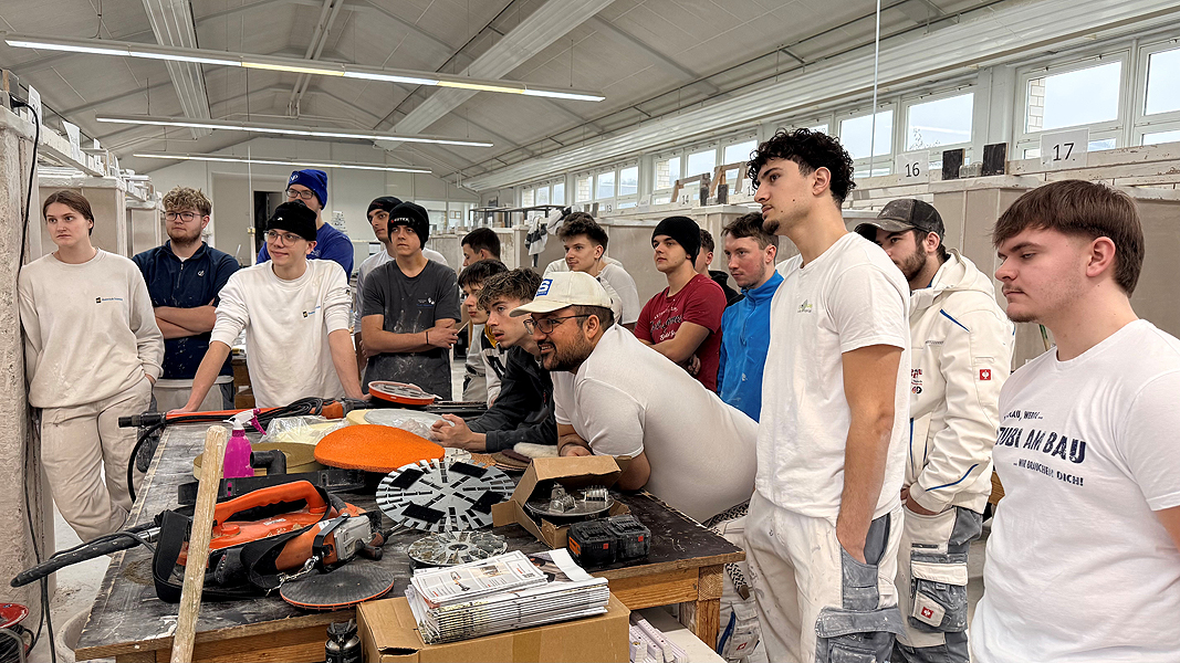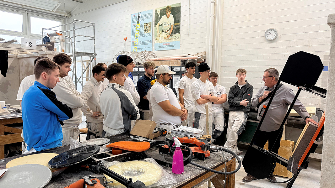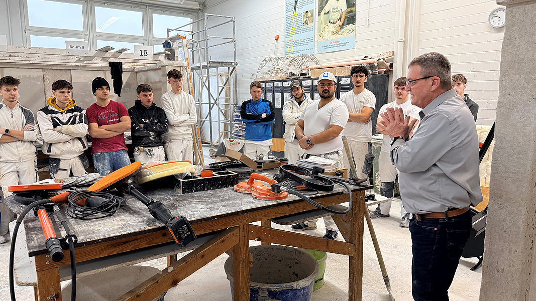 Die leichte Universalmaschine "Chameleon CX", der leichte Langhalsschleifer "Heron" und die Akku- Putzbearbeitungsmaschine "PFM CX" auch als Akku Filzer wurden vorgestellt und konnten von den angehenden Stuckateuren ausprobiert werden.