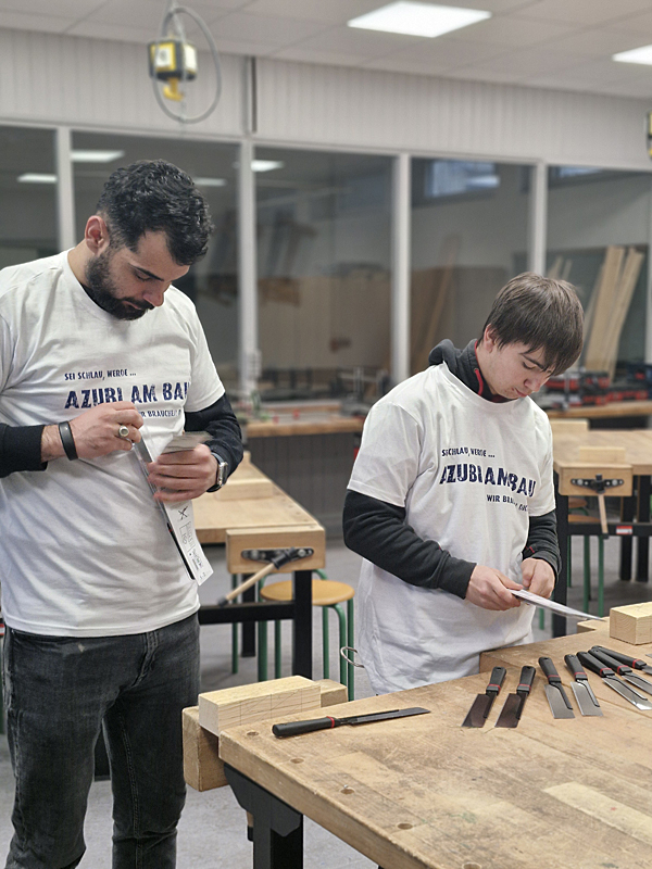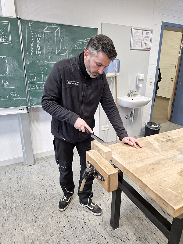 Herr Brust unser Maurer- und Betonbauermeister zeigte anhand einer Sägeübung, wie die Auszubildenden lernen, eine Schalung aus Holz herzustellen.