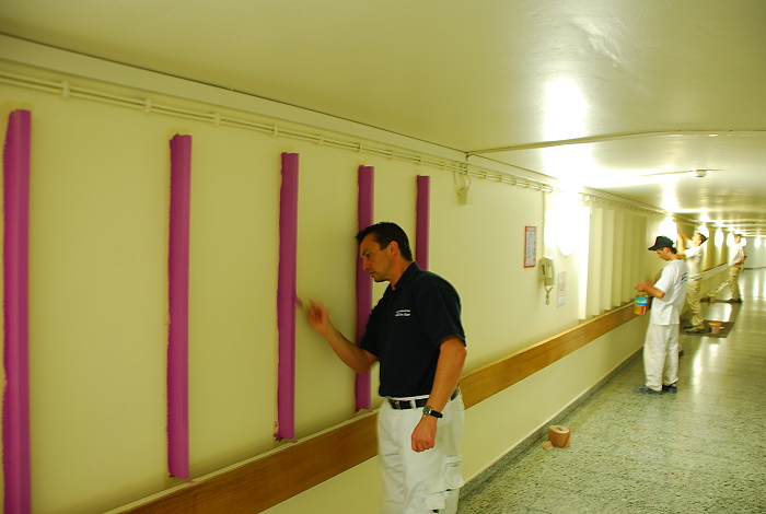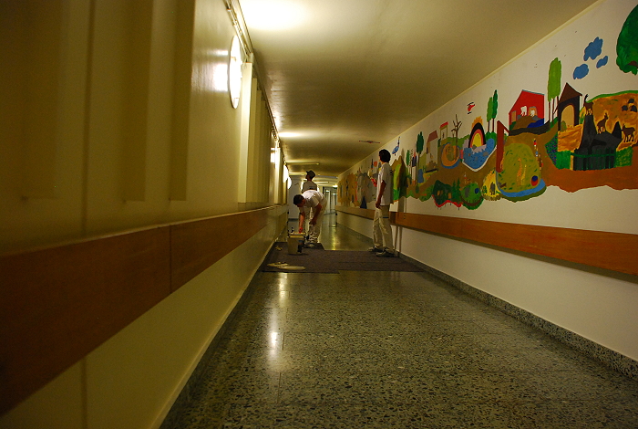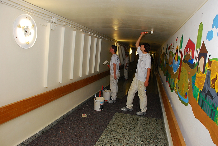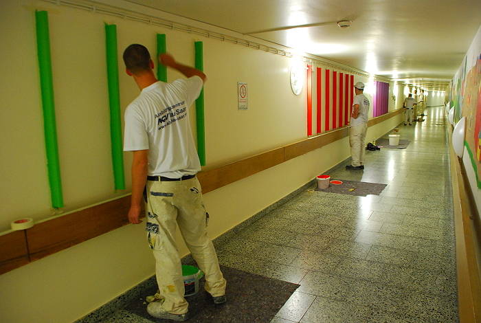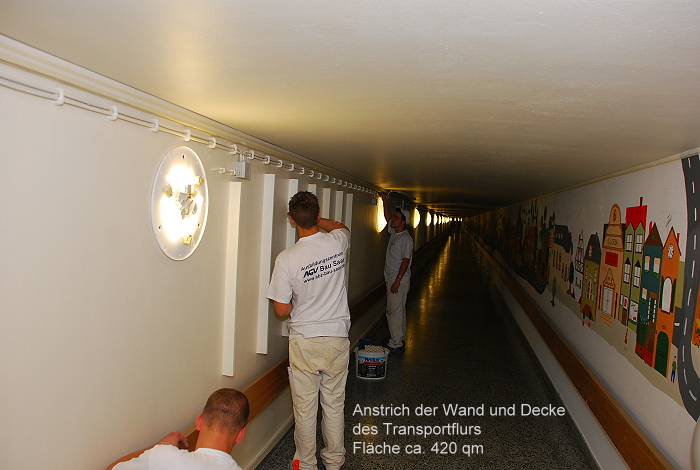 Dabei wurden der Eingangs- und Wartebereich der Kinderklinik, das Wartezimmer und der über 100 Meter lange unterirdische Transportflur von der Kinderklinik ins Hauptgebäude neu gestaltet.