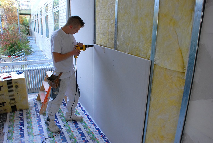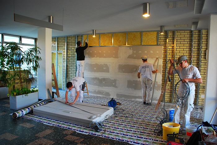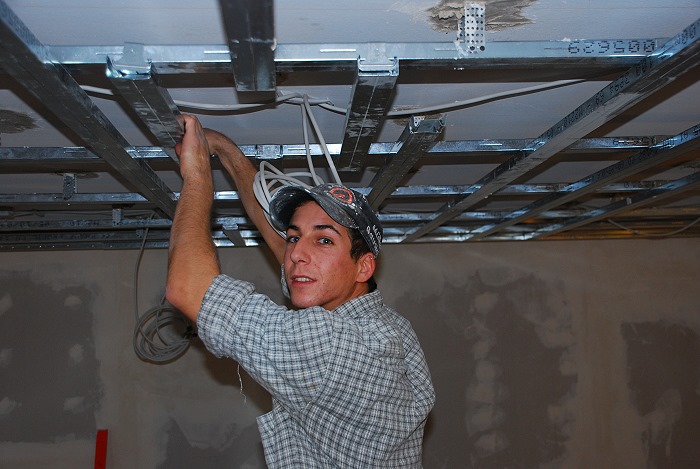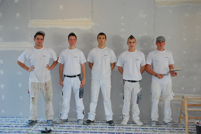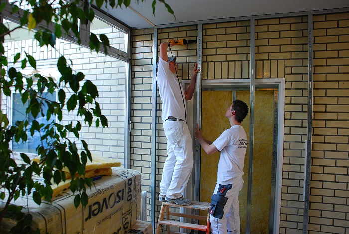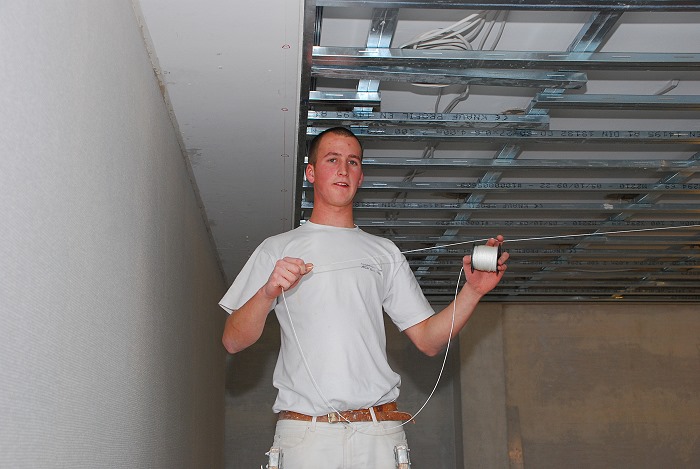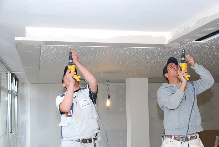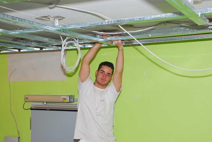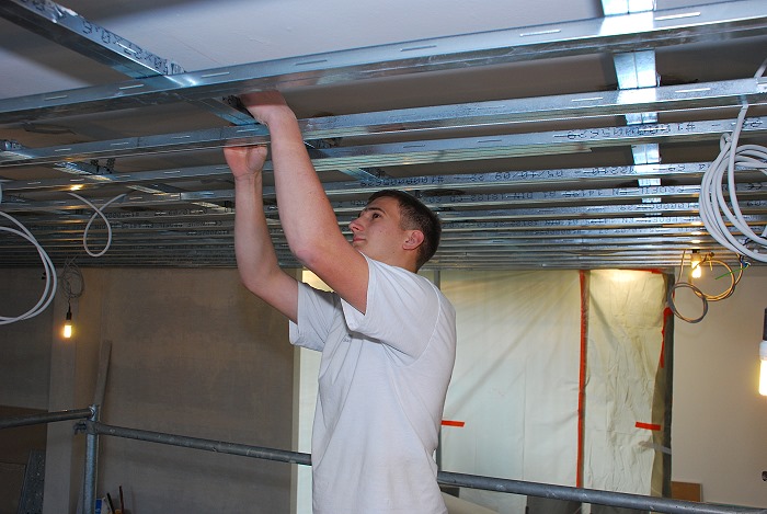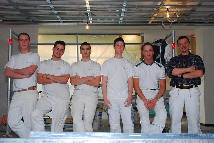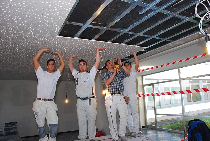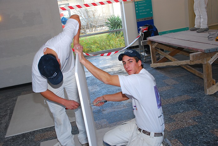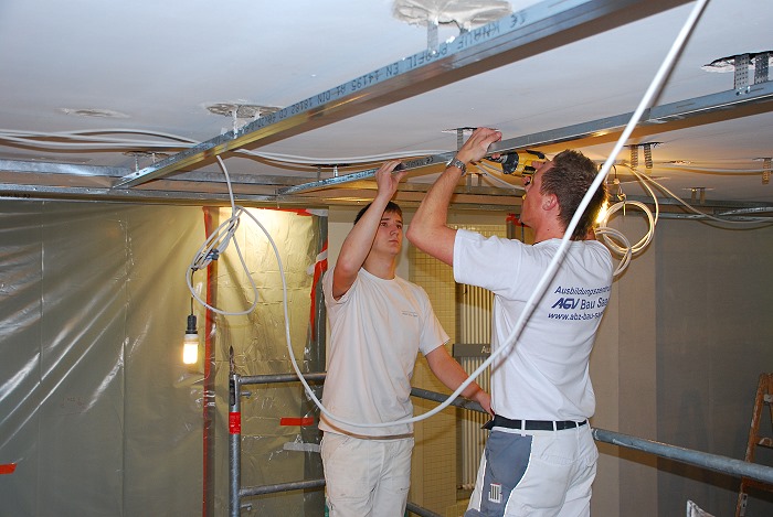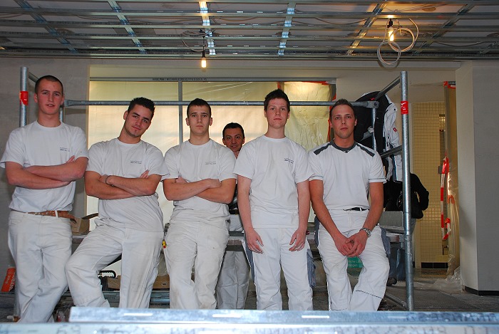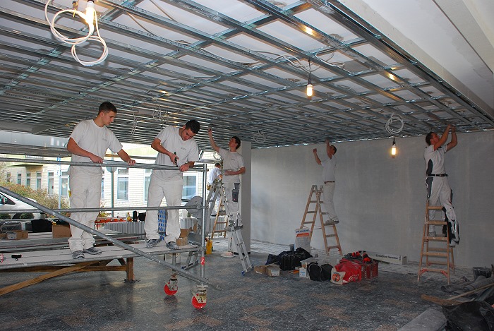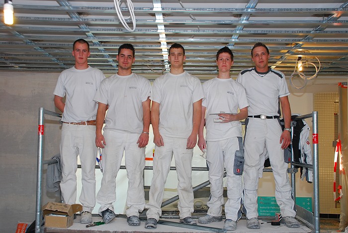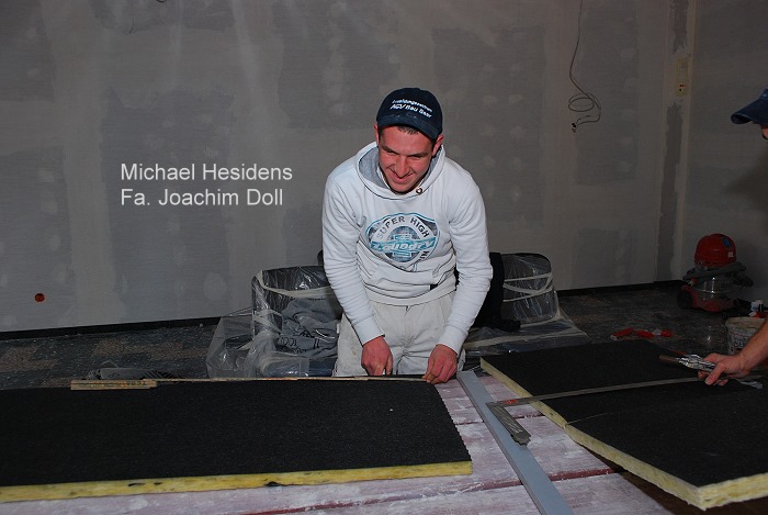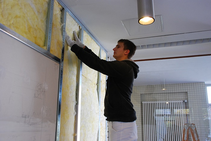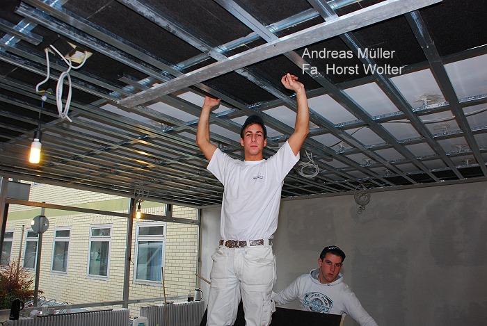 Ein neues Team (3. Lehrjahr Stuckateure)        Die Mineralwolle zur Schalldämmung wird eingebaut!