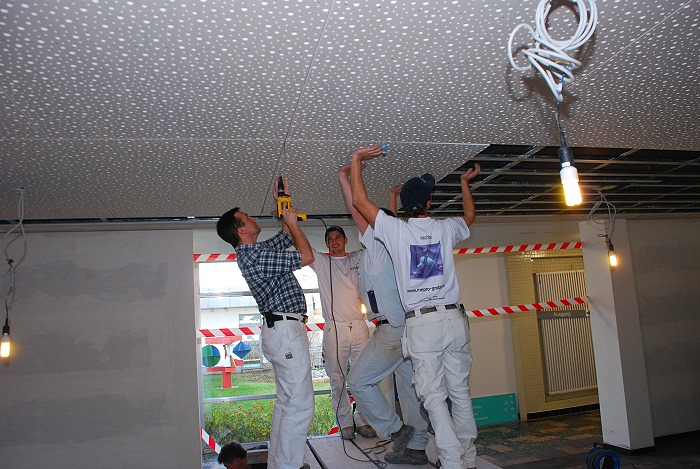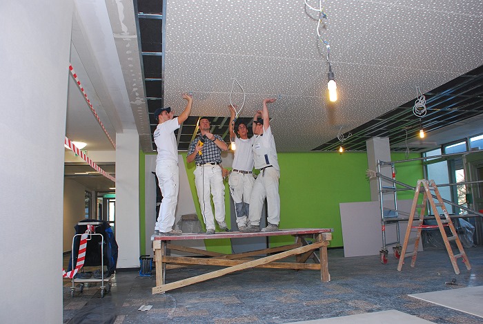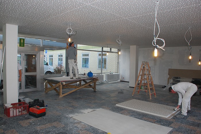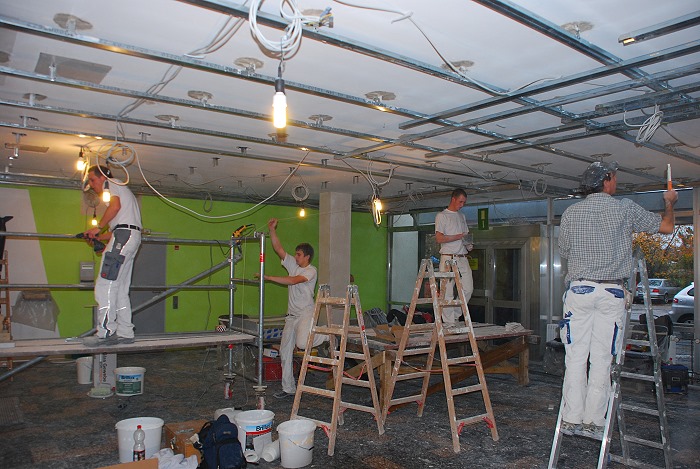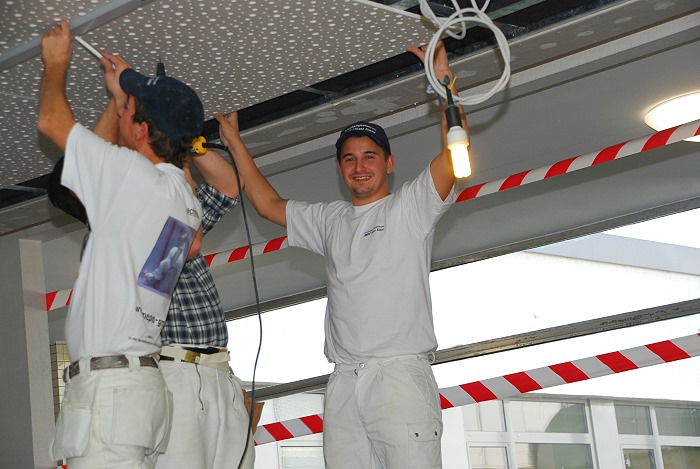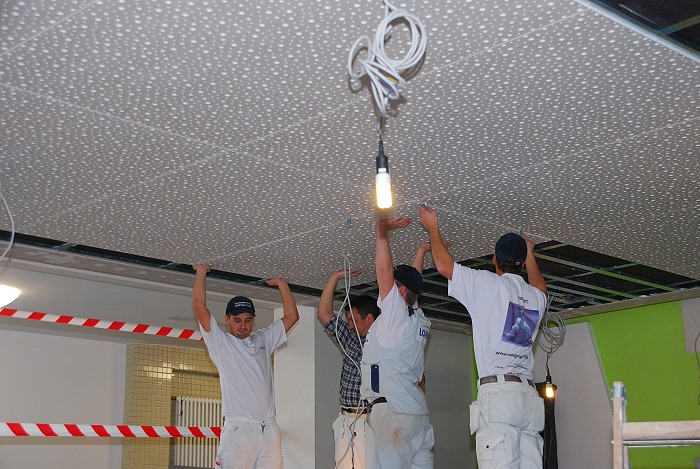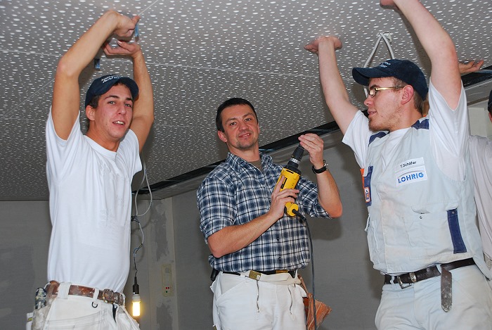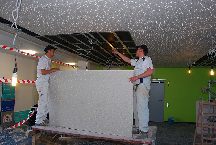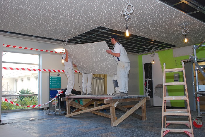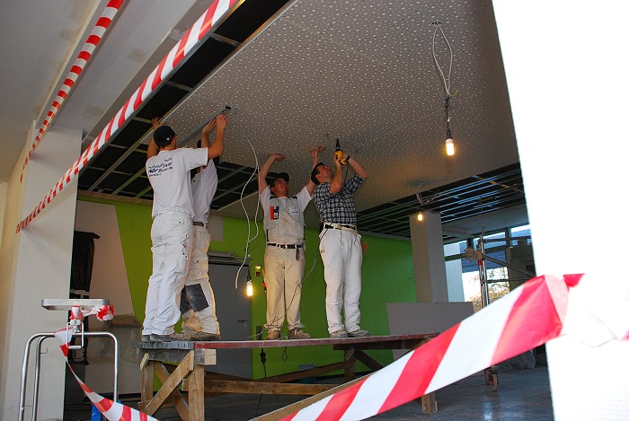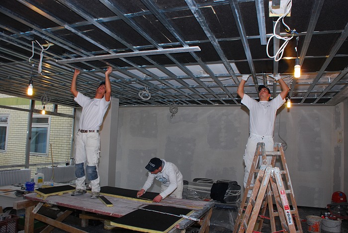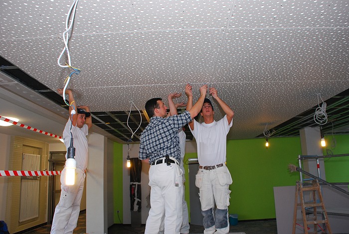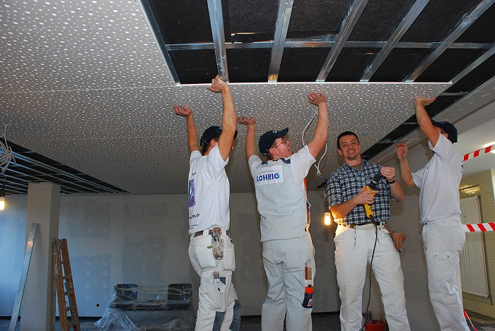 Montage der Akustikplatten                               Gut gelaunte Handwerker