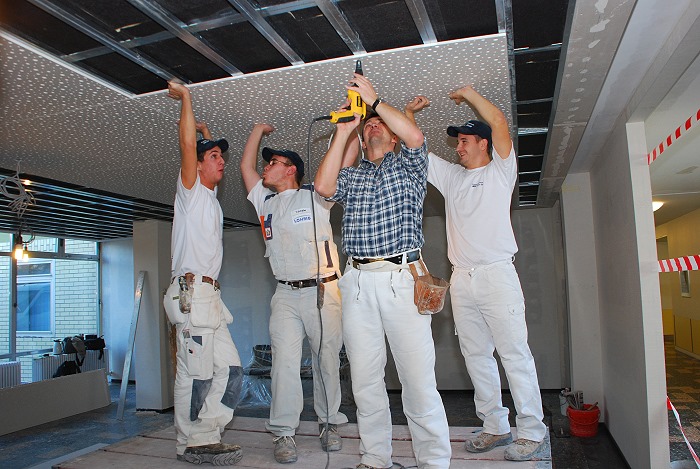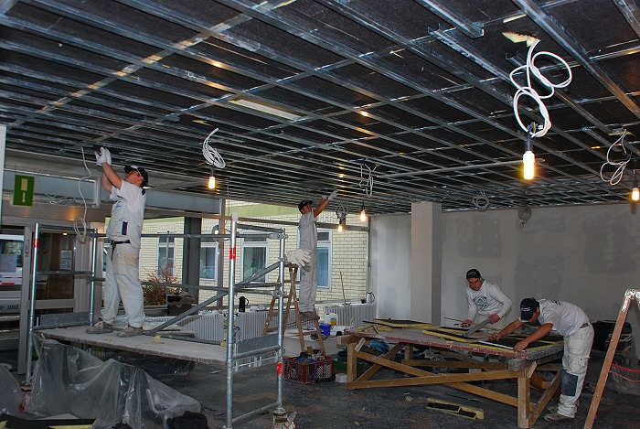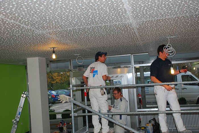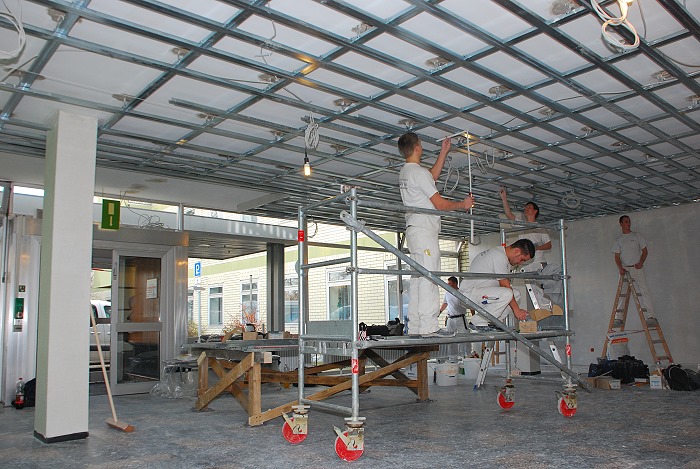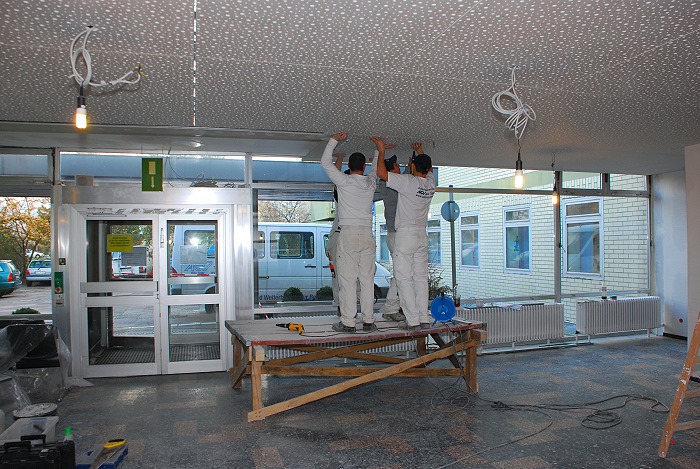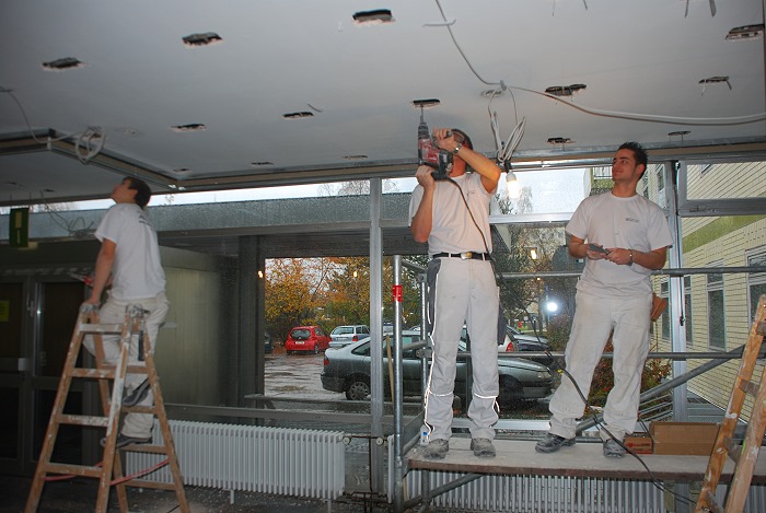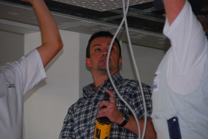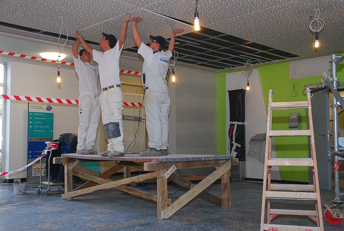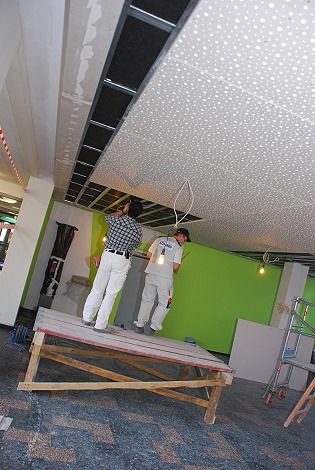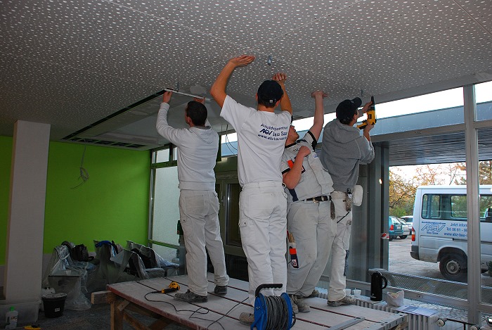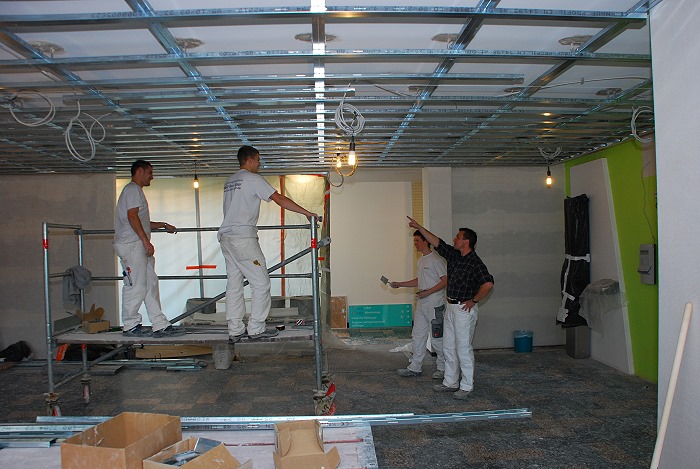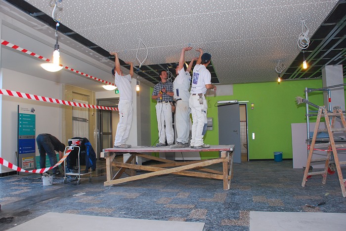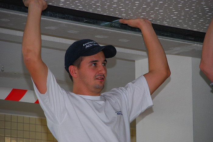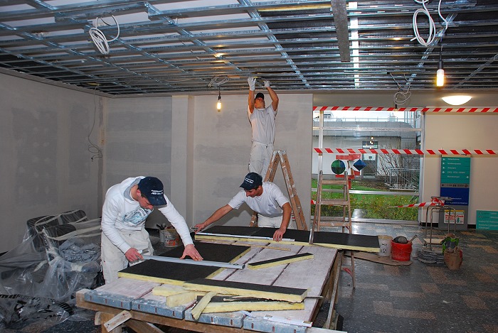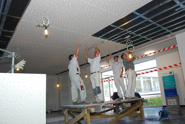 Montage der Akustikplatten                               Gut gelaunte Handwerker