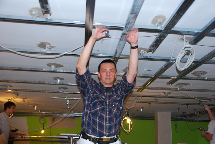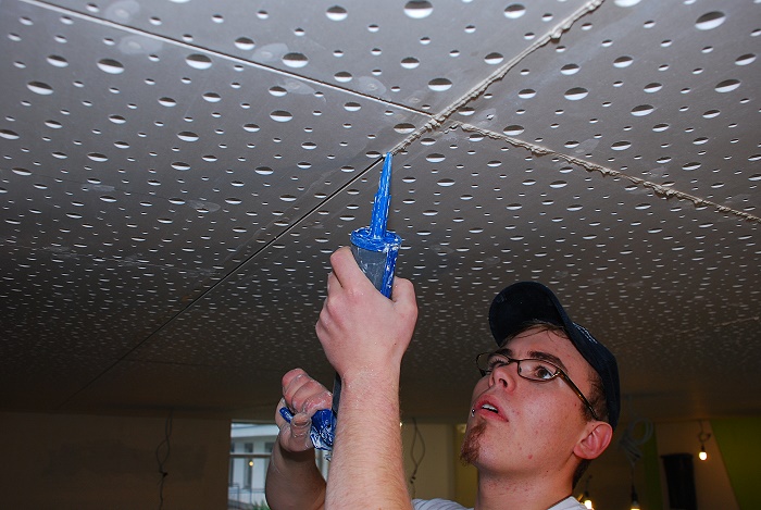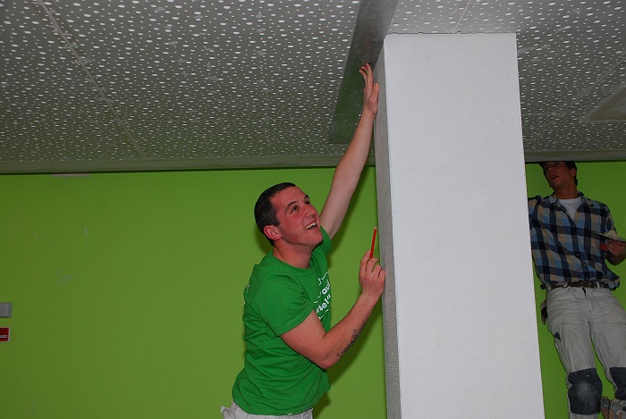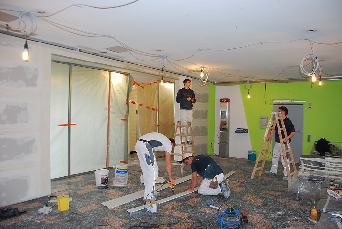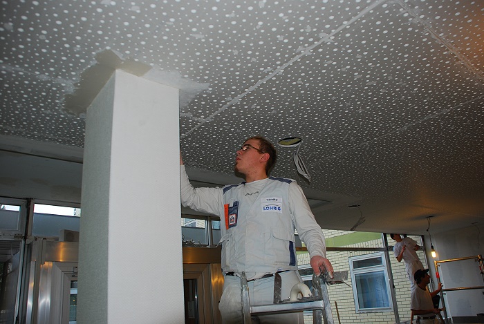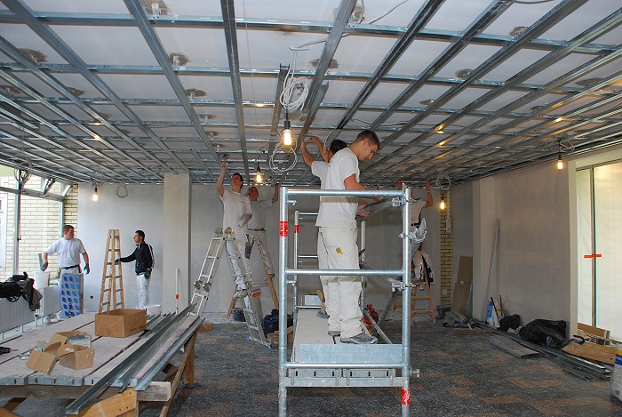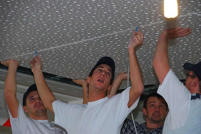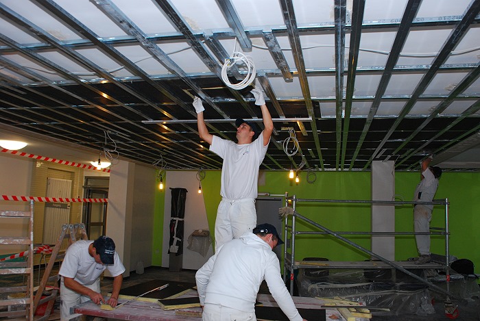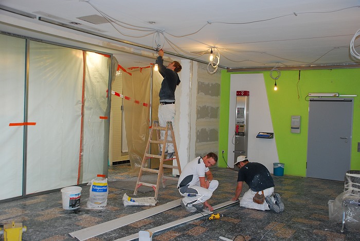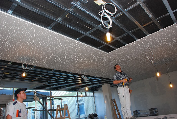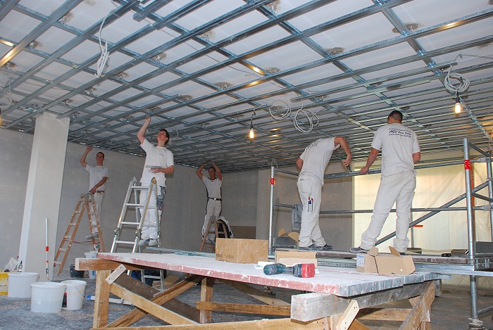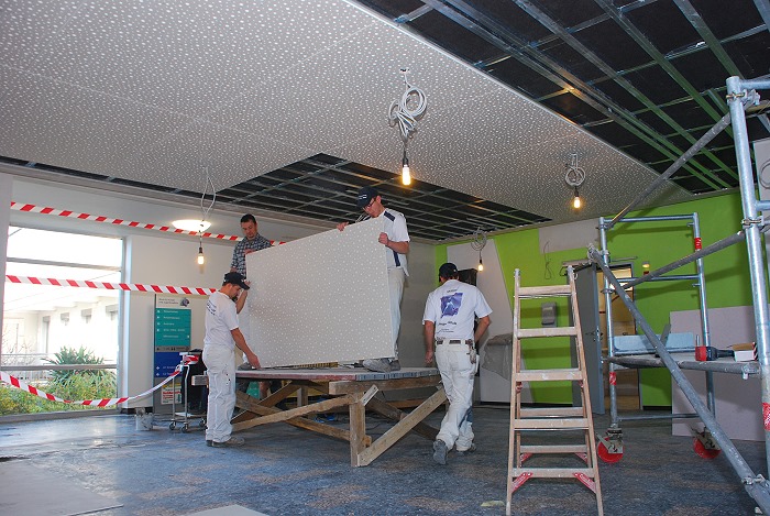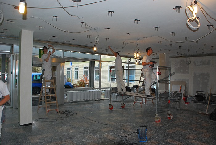 Montage der Akustikplatten                               Gut gelaunte Handwerker