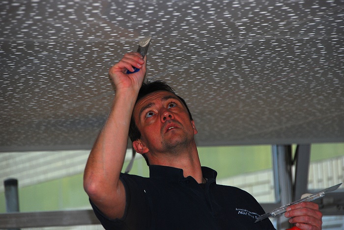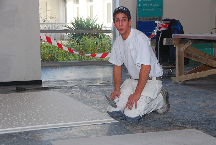 Die Montage erfolgt auf den Millimeter genau  Platte für Platte (insgesamt ca. 80 m²)