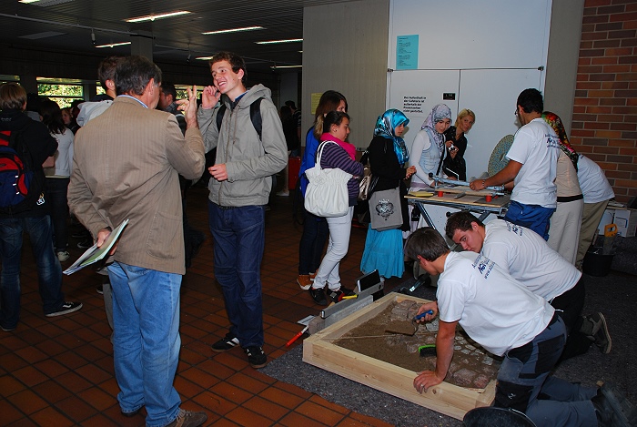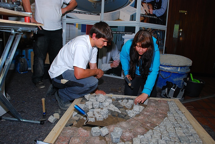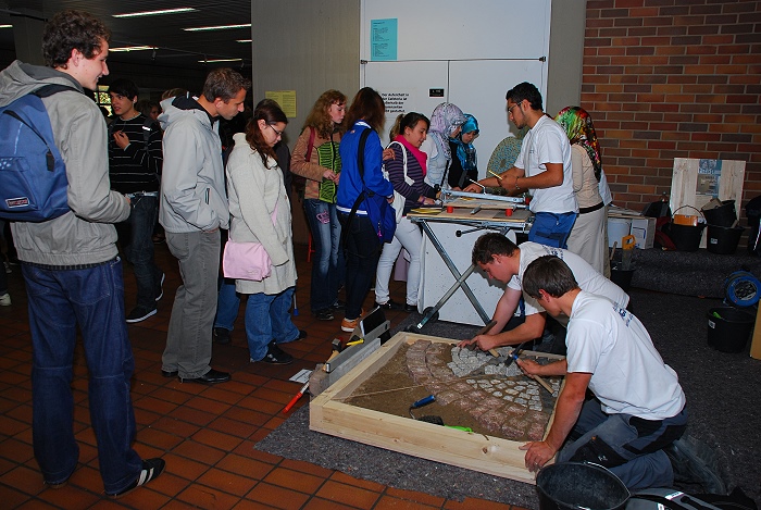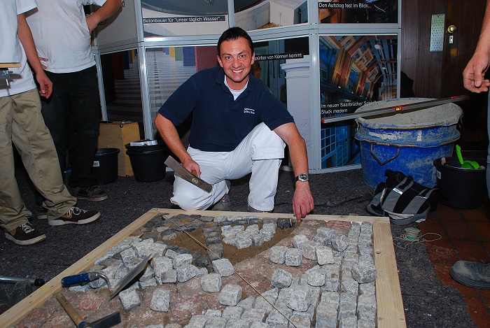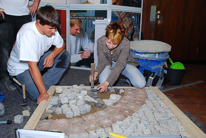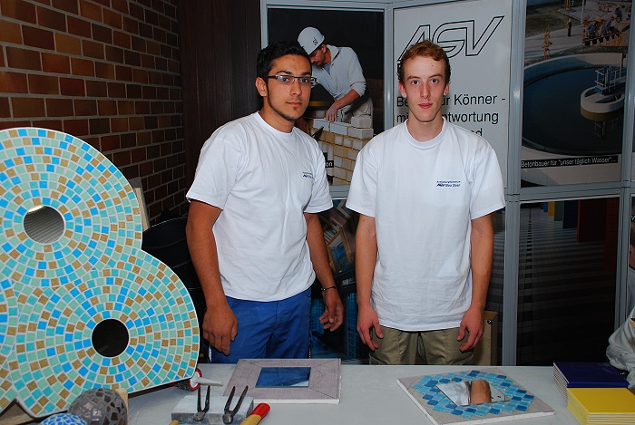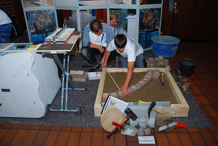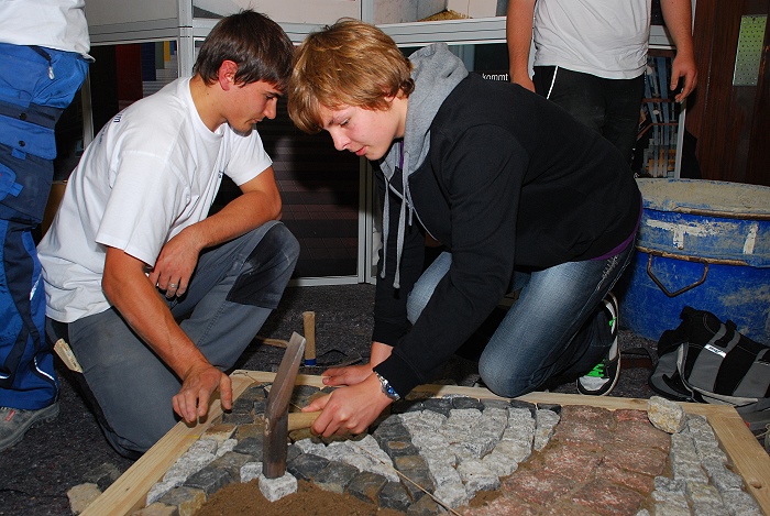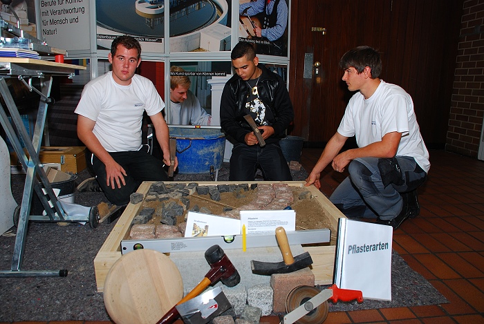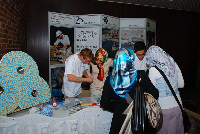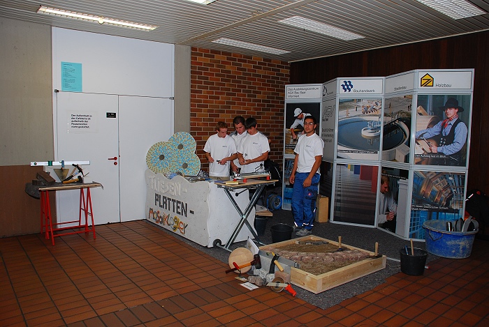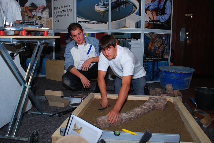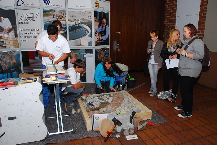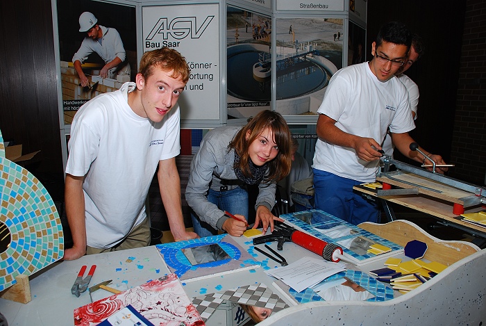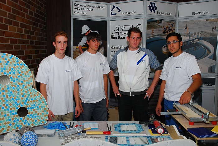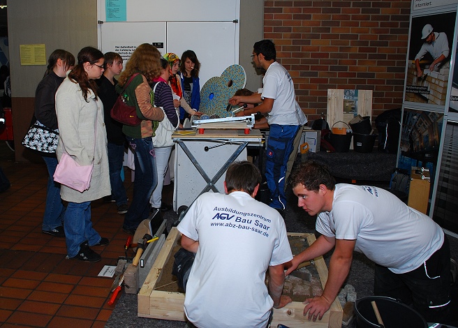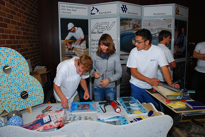 Stuckateurmeister Michael Detemple vom Ausbildungszentrum AGV Bau Saar beteiligte sich an der Ausbildungsbörse 2010 mit einer lebendigen Baustelle, vertreten durch die Berufe Fliesen-, Platten- und Mosaikleger und Straßenbauer.