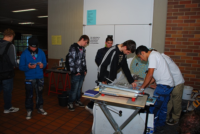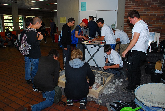 Die Schüler informierten sich in den Workshops über eine Ausbildung und Aufstiegsmöglichkeiten in der Bauwirtschaft und konnten auch in den Pausen den motivierten Auszubildenden Fragen stellen und selbst eimal den ein- oder anderen Handgriff in den dargestellten Berufen ausprobieren!