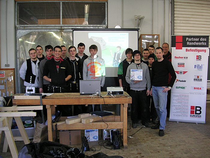 Der Schulungsleiter Herr Clemens Kraus vermittelte den Auzubildenden zum Zimmerer und zum Stuckateur im 2. Ausbildungsjahr alles Wissenswerte für die schnelle und sichere Verarbeitung der SIGA-Hochleistungs-Produkte an Hand  der Verarbeitungsanleitungen für Profi-Verarbeiter.