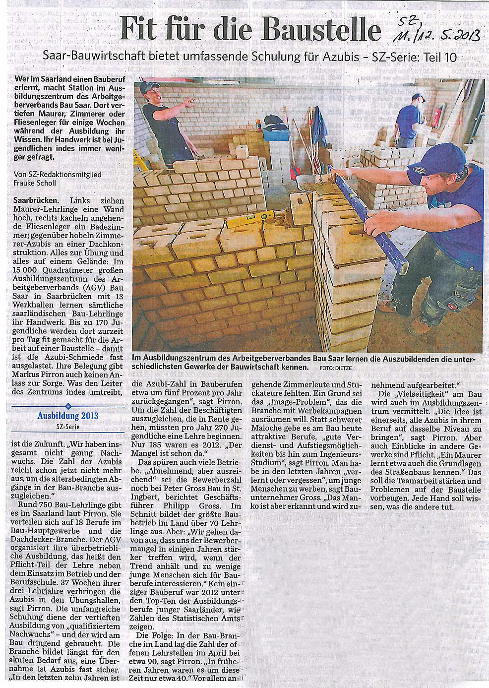 Sie ist die überbetriebliche Ausbildungsstätte des Bauhauptgewerbes und eine hundertprozentige Tochter des Arbeitgeberverbandes der saarländischen Bauwirtschaft. Bereits 1937 haben weitschauende Bauunternehmer an der Saar die Notwendigkeit erkannt, ihren beruflichen Nachwuchs nicht nur in den Betrieben praktisch auszubilden, sondern -wegen der enormen Vielseitigkeit und Unterschiedlichkeit der Bauberufe - auch ergänzend überbetrieblich auf einer Lehrbaustelle zu unterweisen. Das Zentrum stellt sich heute als die größte privatwirtschaftlich betriebene Einrichtung ihrer Art im Südwesten dar.