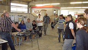 Herr Bernd Bappert von der Firma Kaufmann, stellte uns verschiedene Werkzeuge vor. Von der Schneidmaschine und Bohrkronen bis Schleifpad und Arbeitsschutz. An einer Arbeitsstation konnten die Azubis auch direkt die Werkzeuge ausprobieren.