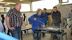 Vorführung von Werkzeugen für das Fliesenlegerhandwerk.