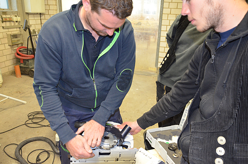 Die Azubis hatten reichlich Gelegenheit zum Ausprobieren erhalten, es fand ein reger Ehrfahrungsaustausch über die Einsatzmöglichkeiten der Maschinen in der Praxis statt. Besonderes Interesse fanden die leistungsstarken Akkubohrschrauber, die Kappsäge „Kapex“, die Handkreissage mit Nutfräser und die vielfaltigen Führungsschienensysteme.