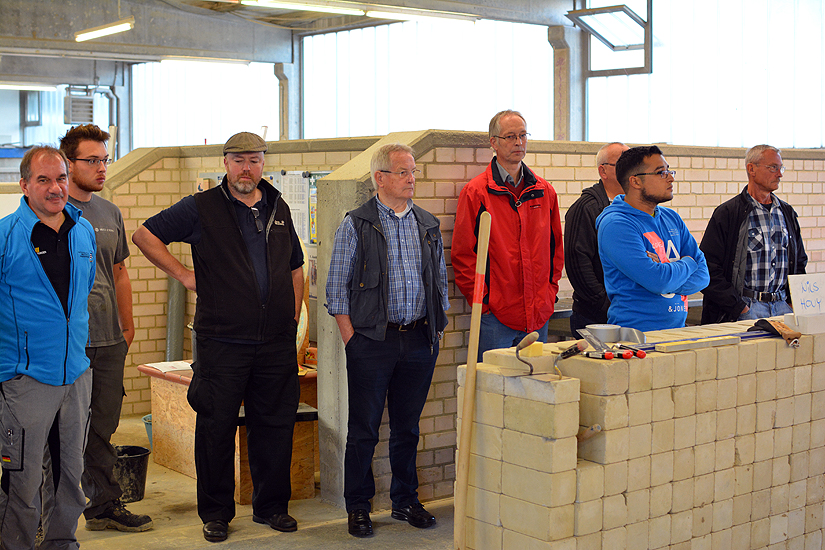 Zu erstellen war eine rechtwinklige Mauerecke, in der Wandstärke 11,5 cm, mit einem Eckeinschnitt unter 135°. Verarbeitet wurden KS-NF, mit entsprechender Fugenausbildung, als Sichtmauerwerk. In den beiden, um Wandstärke zurückspringenden Nischen, waren mit Klinkern Ornamente einzuar­beiten.