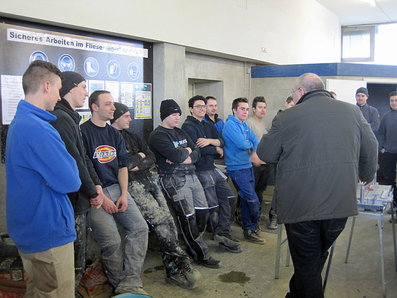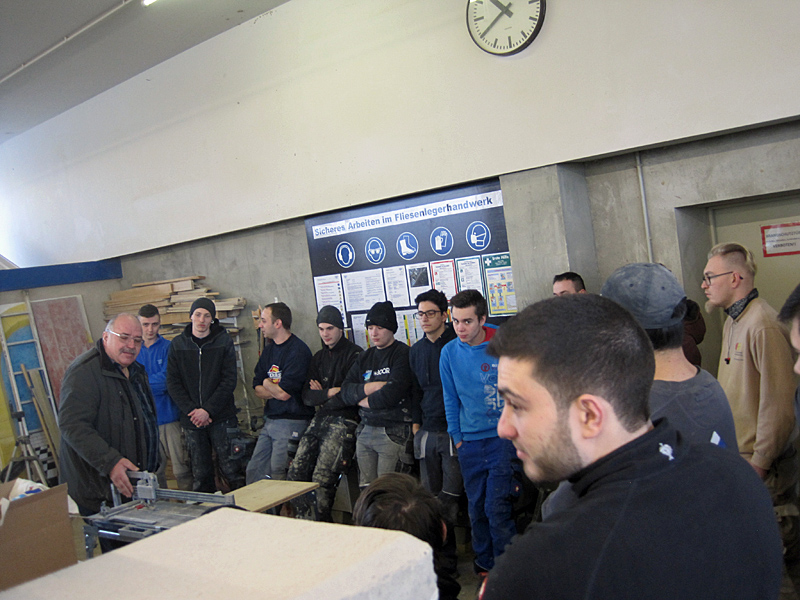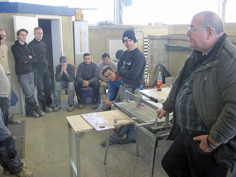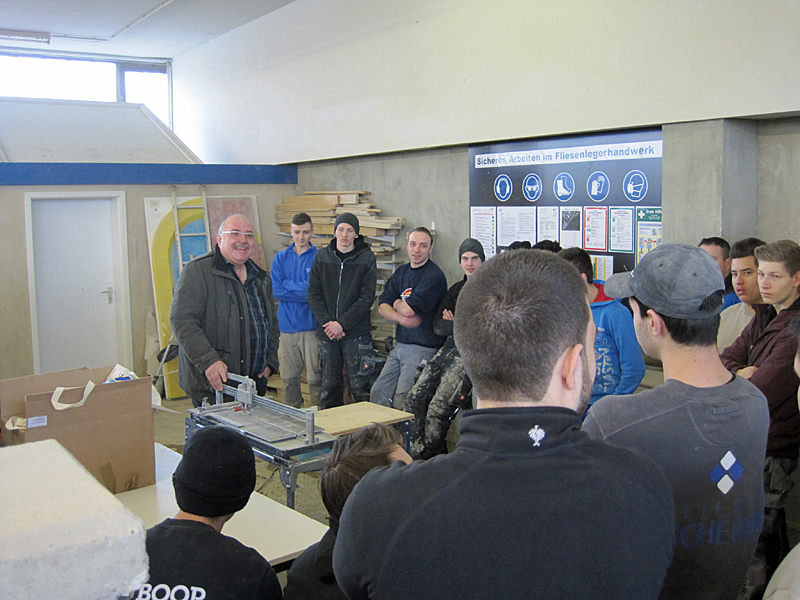 Vorführung von Werkzeugen für das Fliesenlegerhandwerk.