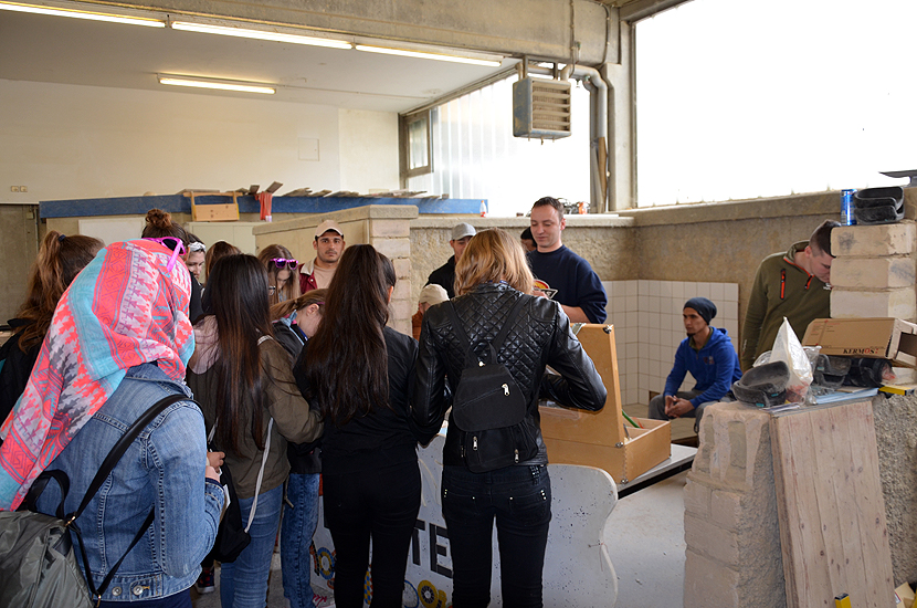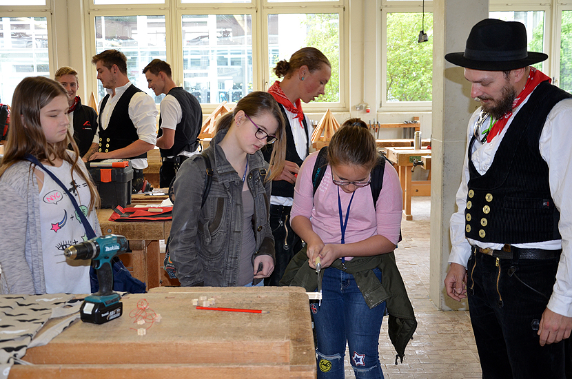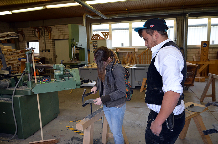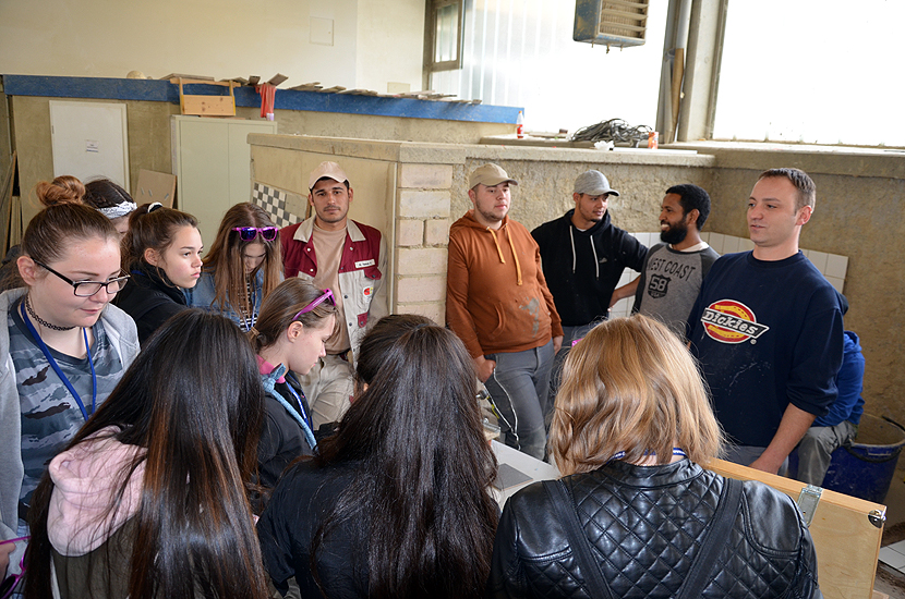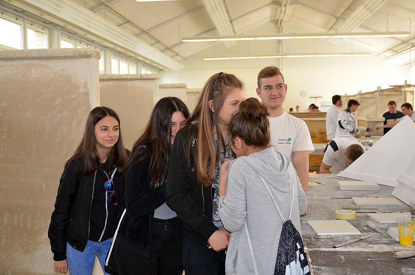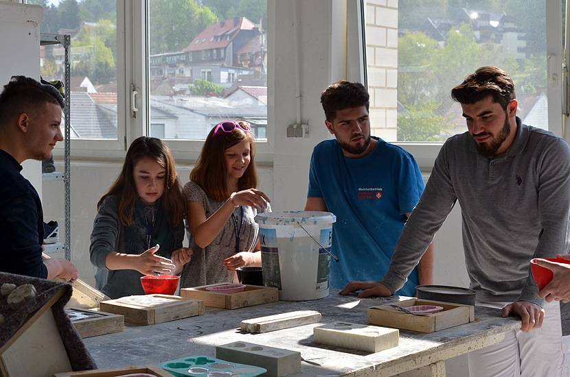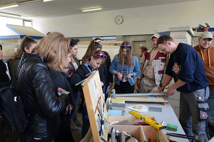 54 Besucherinnen kamen zum Ausbildungszentrum. Die Mädchen konnten sich im ABZ je nach Interesse die verschiedenen Werkstätten anschauen. Es ist ein großer Vorteil des ABZ – dass man in mehrere Berufe gleichzeitig reinschnuppern kann. In den einzelnen Werkbereichen ist die praktische Tätigkeit an Werkstücken jederzeit möglich und erwünscht. Ebenso ist gewünscht, dass die Auszubildenden, die zurzeit selbst in Ausbildung stehen und Ausbilder zu den Ausbildungsberufen befragt werden. Daneben wurden in allen Bereichen zusätzliche Aktionen für die Mädchen angeboten. Der Tag im ABZ sollte das Handwerk greifbar machen und so konnten die Mädchen z. B. in den Berufen Stuckateur, Maurer, Betonbauer, Fliesen- u. Plattenleger oder Zimmerer gleich selbst Hand anlegen. Begeistert bearbeiteten sie Schieferplatten, Fliesen, arbeiteten mit Putz und Farbe, mauerten, knackten Steine, schätzten Gewichte von Steinen, bearbeiteten Specksteine, nivellierten, sägten und nagelten.