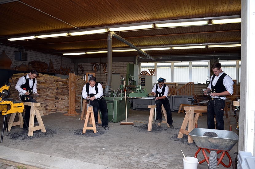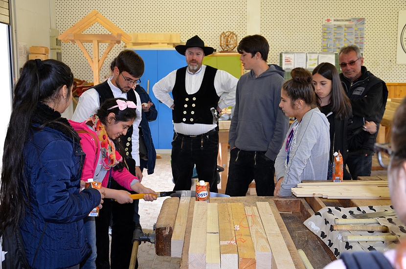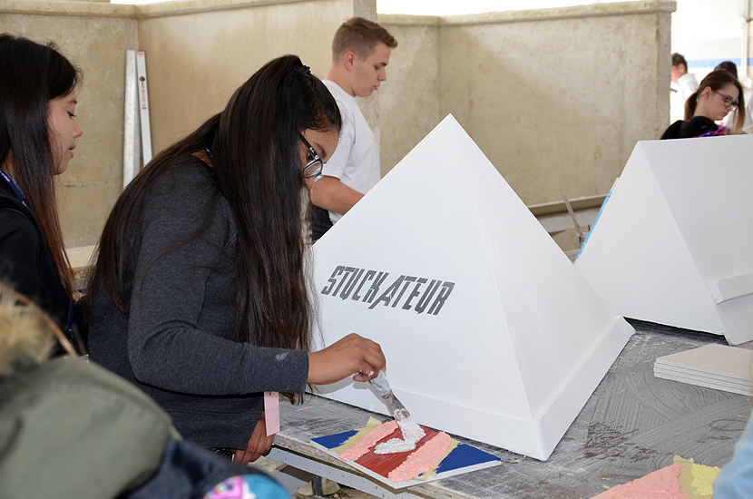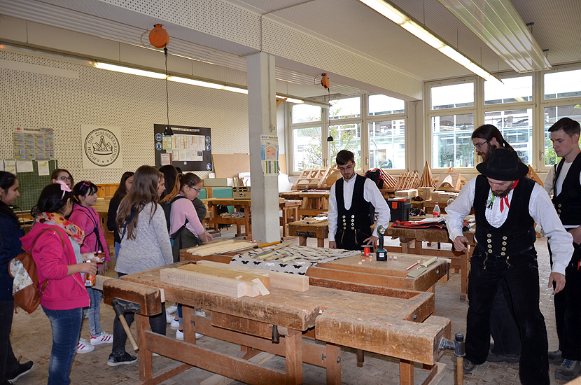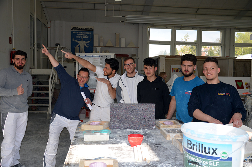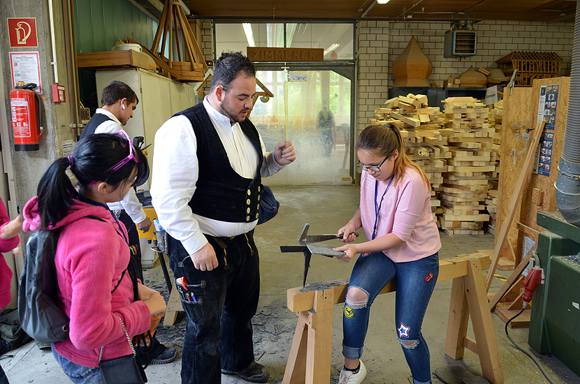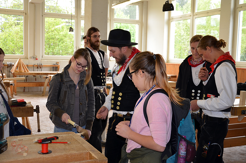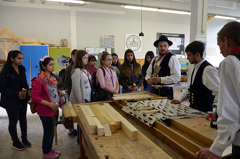 54 Besucherinnen kamen zum Ausbildungszentrum. Die Mädchen konnten sich im ABZ je nach Interesse die verschiedenen Werkstätten anschauen. Es ist ein großer Vorteil des ABZ – dass man in mehrere Berufe gleichzeitig reinschnuppern kann. In den einzelnen Werkbereichen ist die praktische Tätigkeit an Werkstücken jederzeit möglich und erwünscht. Ebenso ist gewünscht, dass die Auszubildenden, die zurzeit selbst in Ausbildung stehen und Ausbilder zu den Ausbildungsberufen befragt werden. Daneben wurden in allen Bereichen zusätzliche Aktionen für die Mädchen angeboten. Der Tag im ABZ sollte das Handwerk greifbar machen und so konnten die Mädchen z. B. in den Berufen Stuckateur, Maurer, Betonbauer, Fliesen- u. Plattenleger oder Zimmerer gleich selbst Hand anlegen. Begeistert bearbeiteten sie Schieferplatten, Fliesen, arbeiteten mit Putz und Farbe, mauerten, knackten Steine, schätzten Gewichte von Steinen, bearbeiteten Specksteine, nivellierten, sägten und nagelten.
