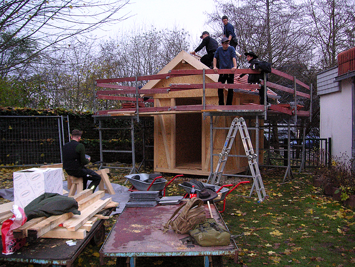Das Haus wurde als Fachwerk errichtet, die Gefachung wird von den Maurern noch ausgemauert. Die Deckung erfolgte als Biberdoppeldeckung mit Kronendeckung im Firstbereich. Giebel und Windbretter wurden traditionell verschiefert. Die Azubis führten die Arbeiten mit viel Freude und Energie aus.