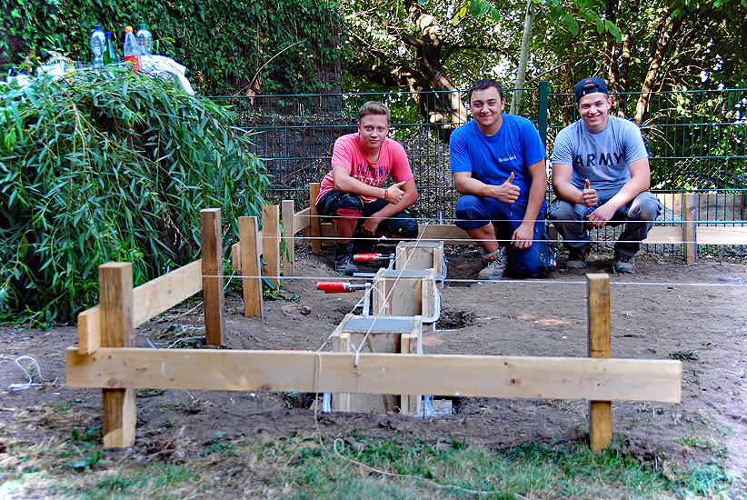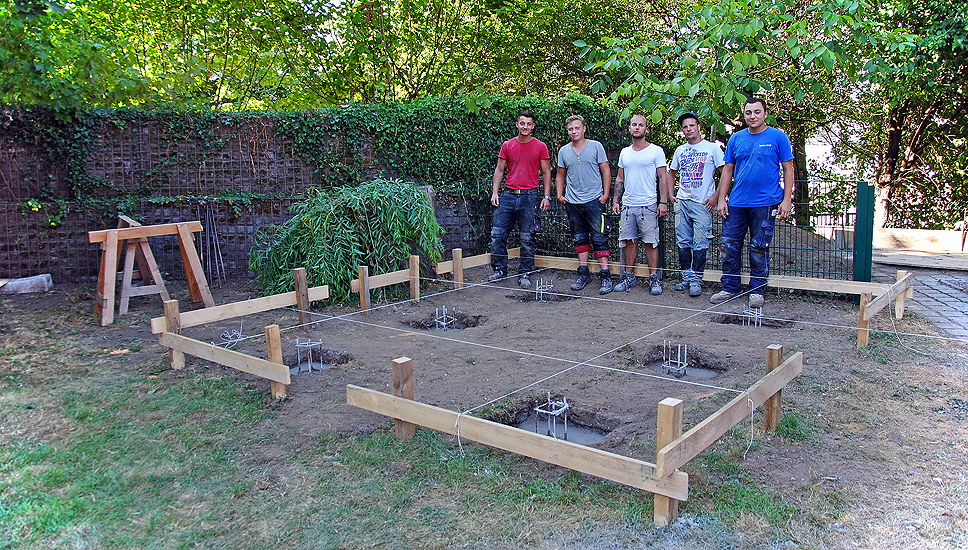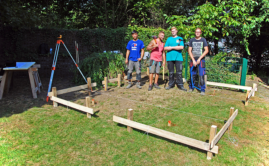 Auszubildende des Maurerhandwerks haben nach Erstellung eines Schurgerüstes die Fundamente betoniert und den Regenspritzschutz angebracht.