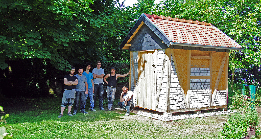 Auszubildende des Zimmerer- und des Maurerhandwerks haben mit Ihren Ausbildern im Laufe ihrer Ausbildung ein Fachwerkhaus gebaut, das der katholischen KiTa als Geräteschuppen dient.