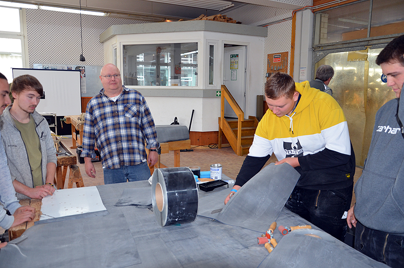 Die Firma Dachprotect stellt in einem Workshop den Azubis eine EPDM-Dachabdichtungsbahn vor, die großflächig auf Bestellung (auf Wunsch bis an die Baustelle) angeliefert wird.