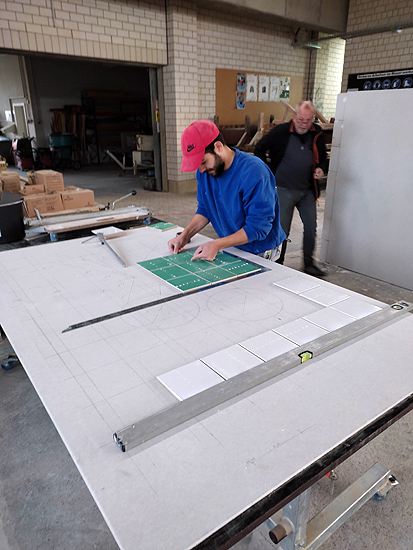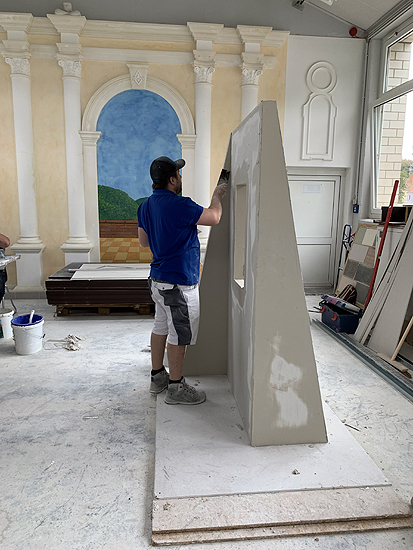Ein besonderer Schwierigkeitsgrad der Arbeit waren die Anschlüsse der schrägen Seitenwände an die Hauptwand. Hierbei entstanden besonders kniffelige Details, die der Saarländische Teilnehmer mit Bravour meisterte.