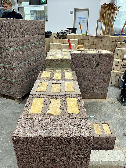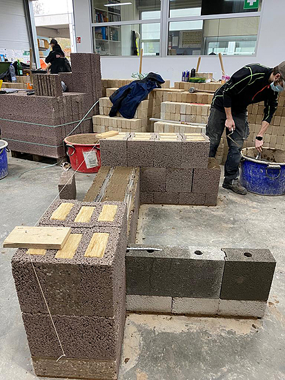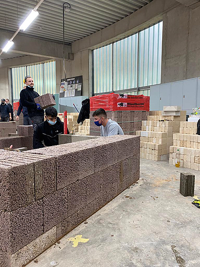 Nach der Mittagspause durften die angehenden Maurer dann zeigen, was sie am Vormittag theoretisch gelernt hatten. In Maurerteams zu je 3-4 Mann wurden anhand von Bauplänen Bisotherm-Steine, einschließlich des Anlegens der Ausgleichsschicht, verarbeitet. Dabei kamen sowohl die mit Mineralwolle gefüllten Bisomark-Steine als auch Bisoplan-Steine, ohne Zusatzdämmung, zum Einsatz.