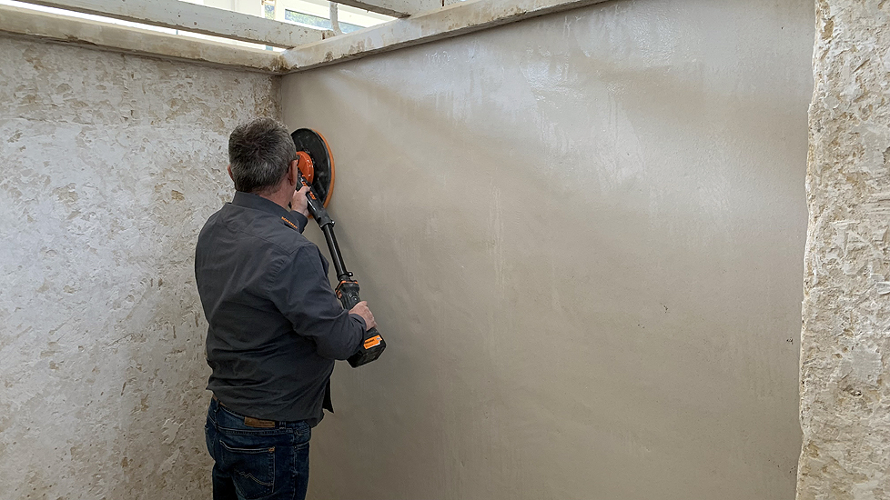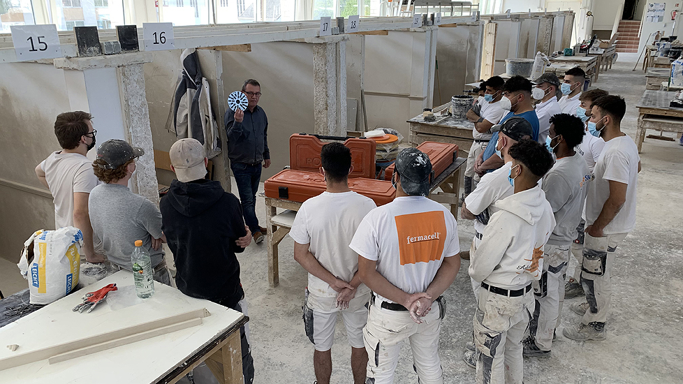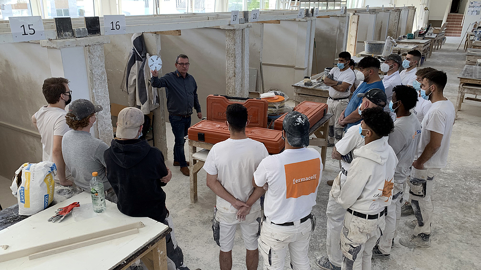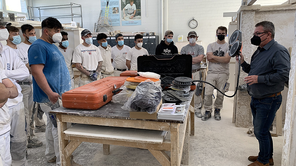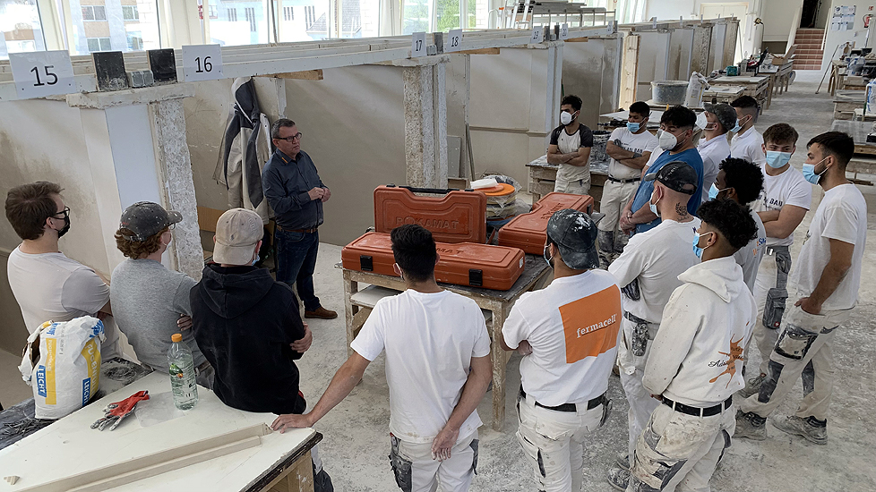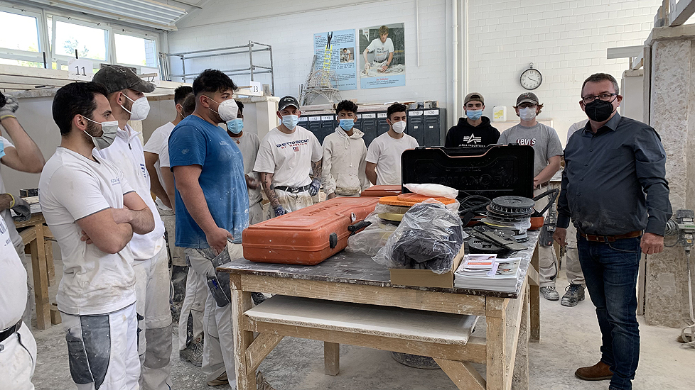Die leichte Universalmaschine "Chameleon", der leichte Langhalsschleifer "Heron", der Turboschleifer "Gecko Rapid" und die Spezialfilzmaschine "Dry" auch als Akku Filzer wurden vorgestellt und konnten von den angehenden Stuckateuren ausprobiert werden.