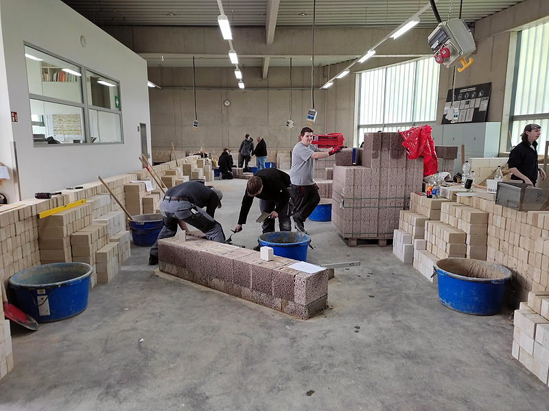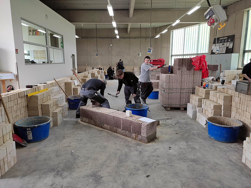 Nachdem die Fehler gefunden und besprochen waren, ging es mit viel Elan an das Aufmauern der Wandkonstruktionen. Dabei wurden die Anforderungen und Verarbeitung noch einmal eingehend besprochen. Fehlerquellen und die daraus möglichen Mängel wurden während des praktischen Teils anschaulich diskutiert.