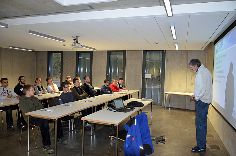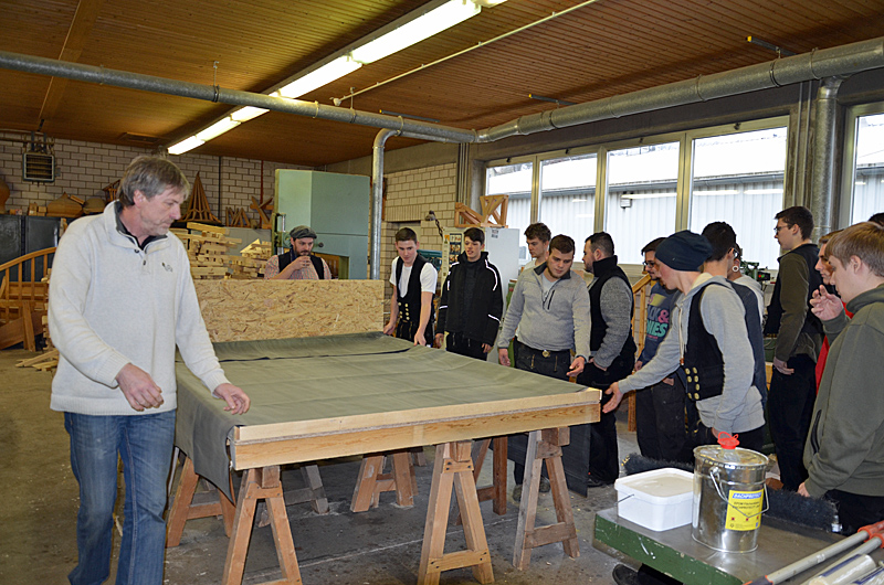 Die Firma Dachprotect stellt in einem Workshop den Azubis eine EPDM-Dachabdichtungsbahn vor, die großflächig auf Bestellung (auf Wunsch bis an die Baustelle) angeliefert wird.