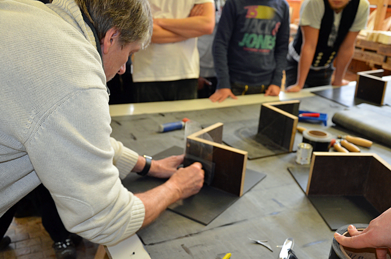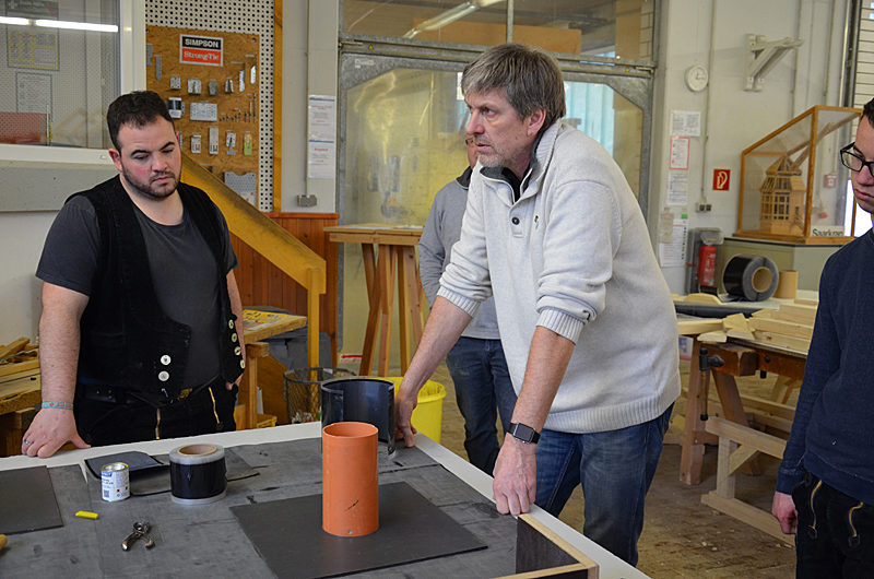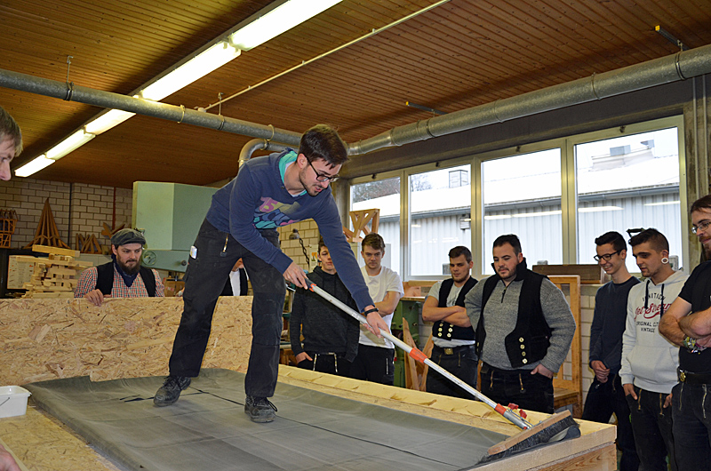 Der Anwendungstechniker Norbert Grube stellte die Produkte in einem Theorieteil vor und erarbeitete in dem anschließenden Praxisteil mit jedem Teilnehmer Innenecken, Außenecken , Durchbrüche und den Einsatz von weiterem Systemzubehör. Gemeinsam wurde ein kleines Flachdach mit Keilbohlen und Wandanschluss hergestellt.