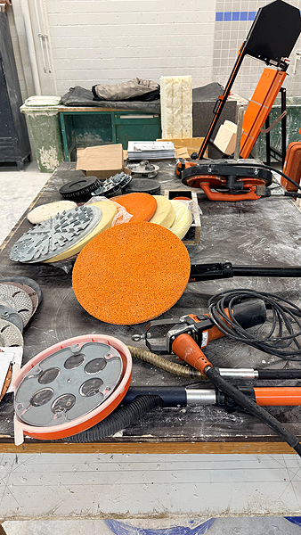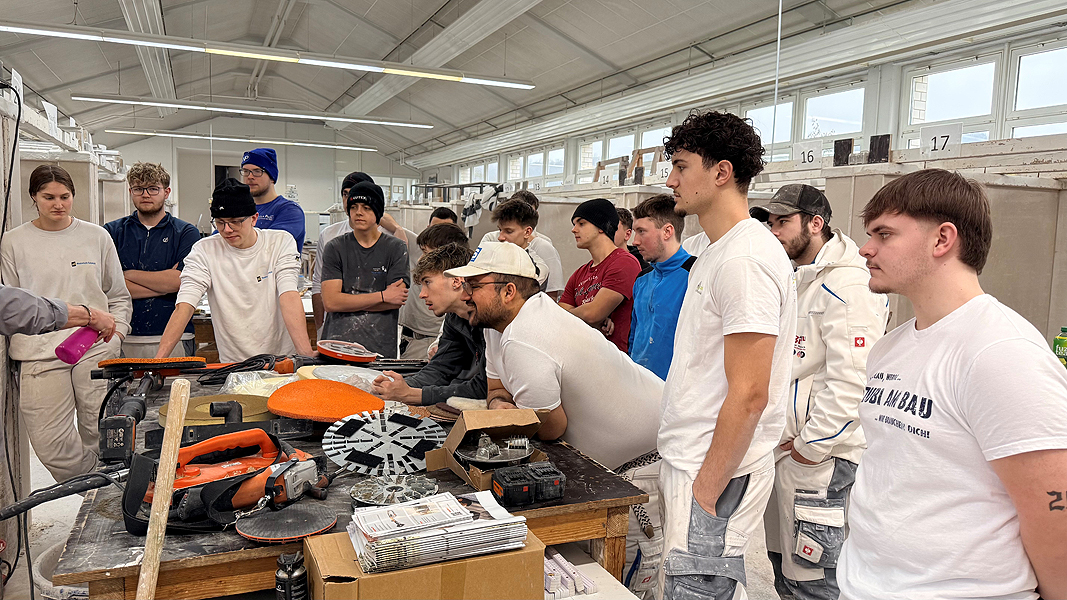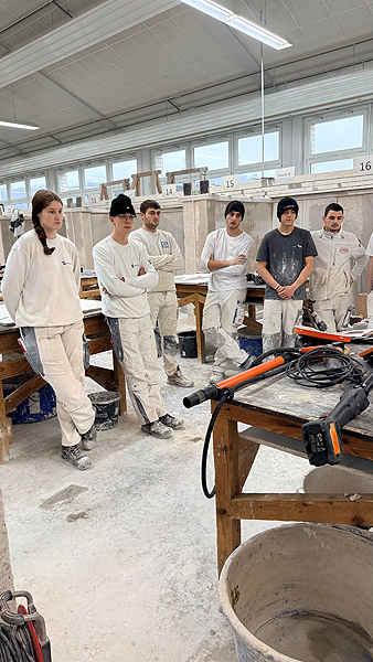 Die leichte Universalmaschine "Chameleon CX", der leichte Langhalsschleifer "Heron" und die Akku- Putzbearbeitungsmaschine "PFM CX" auch als Akku Filzer wurden vorgestellt und konnten von den angehenden Stuckateuren ausprobiert werden.