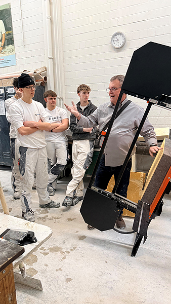 Die Ausbilder der Stuckateure Michael Detemple und Daniel Schäfer zeigten sich begeistert und probierten einige Maschinen selbst aus.
